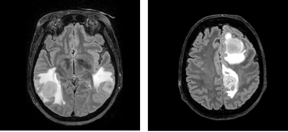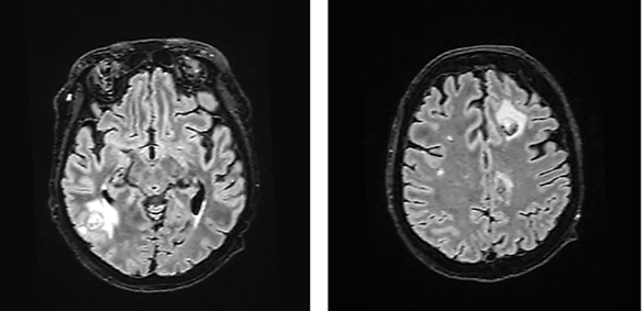 During elbow surgery, the patient experienced respiratory insufficiency, necessitating transfer to the Intensive Care Unit (ICU). Once stabilized, she was moved to the Neurology Department. Subsequent deterioration during a routine morning examination included nausea, diaphoresis, elevated blood pressure (220/90 mmHg), and tachycardia (heart rate 100 bpm). The worsening respiratory insufficiency led to her transfer to the Neurosurgical ICU and subsequent intubation. Despite normal laboratory findings, a chest CT revealed inflammatory infiltration and hypoventilation, but an infection was initially ruled out, precluding antibiotic administration. However, a repeated bronchoscopy culture isolated Proteus Mirabilis, sensitive to Cefuroxime, leading to a diagnosis of respiratory muscle weakness potentially related to myasthenia, and subsequent plasmapheresis was initiated. After extubation and initial stabilization, MRI revealed brain lesions to be consistently recognized as abscesses (Fig. 2).