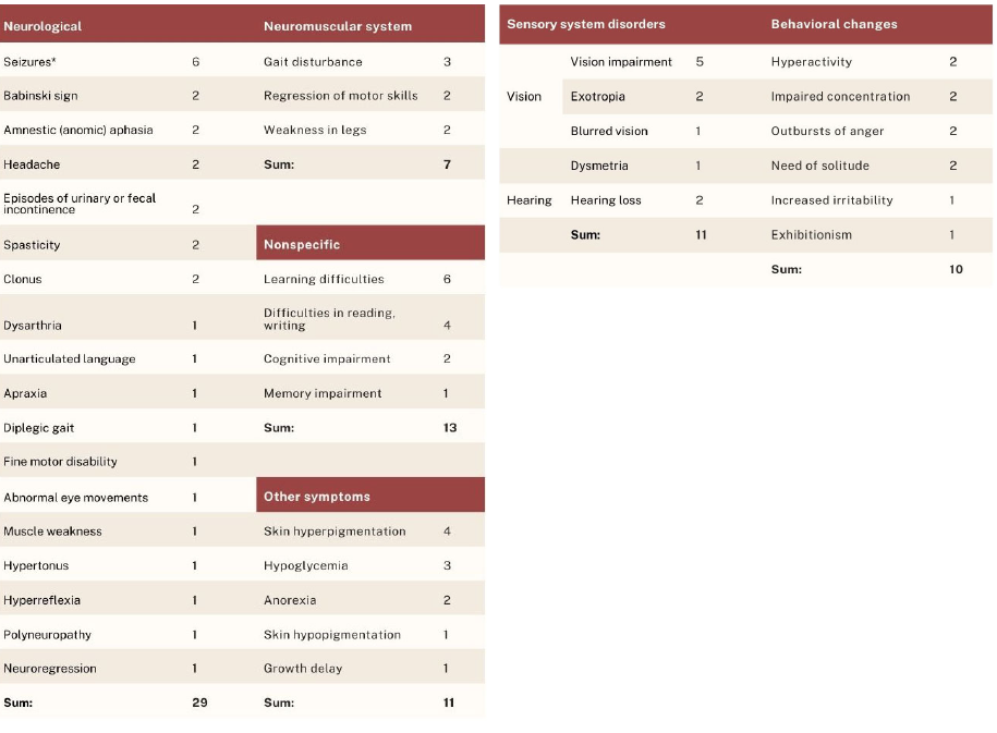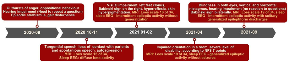 A 7-year-3-month-old boy was hospitalised due to changes in behaviour, episodic strabismus, hearing impairment, and gait difficulties. The parents reported noticing outbursts of anger, increased arguing, the patient was not responding when called from another room, later did not answer the questions and spoke about unrelated topics. The symptoms evolved over 2–3 months (Figure 1). Before the illness, the patient’s psychomotor development was within the normal range, the patient was born from a normal pregnancy and delivery. A family history examination revealed that the patient’s maternal grandmother has been examined for spastic paraparesis, suspected of a demyelination disease, however, the diagnosis was not established.