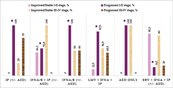 Ribavirin combined with IFN and Isoprinosine demonstrated some of the most favorable outcomes, particularly in the early stages, where 83.3% of patients improved or stabilized. In advanced stages, 80% of patients also improved or stabilized. Here, it is also important to note that the sample sizes were small.