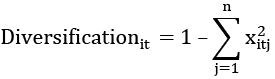 Following the extensive strand of literature on bank diversification, we measure income, assets, funding, and loan portfolios using the Herfindahl-Hirschman Index (HHI). Precisely, our diversification index is developed by subtracting HHI from one, thus the level of diversification increases with the value of the index. The diversification index for bank i in year t is estimated as:
