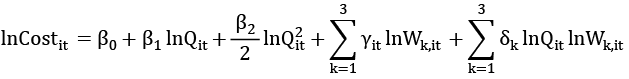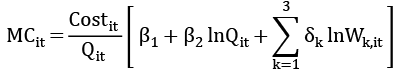 In the translog cost function above, Cost refers to total costs and Q refers to total assets, W1, W2, and W3 represent input prices for labor (expressed as the ratio of personnel costs to total assets), physical capital (quantified as the ratio of other non-interest costs to fixed assets), and funding (indicated by the ratio of interest costs to deposits), respectively. Subsequently, we utilize the coefficients derived from the translog cost function estimation to compute the marginal cost using the following formulation: