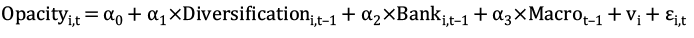 We regress the model of bank opacity that highlights diversification as the primary explanatory variable and control for several key factors as follows: