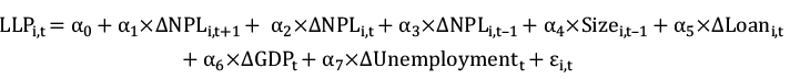 where i and t denote banks and years, respectively. Our dependent variable, LLP, reflects loan loss provisions divided by total assets at the beginning of the year. For bank-specific variables, ΔNPL is the change in non-performing loans scaled by beginning total assets, Size is the natural logarithm of total assets, and ΔLoan captures the change in total loans scaled by total assets at the beginning of the year. Regarding macroeconomic variables, we use the change of the economic growth rate (ΔGDP) and the change of the unemployment rate (ΔUnemployment). Once the regression model is estimated, we take the absolute value of the residuals as discretionary loan loss provisions that exhibit the level of bank earnings management.