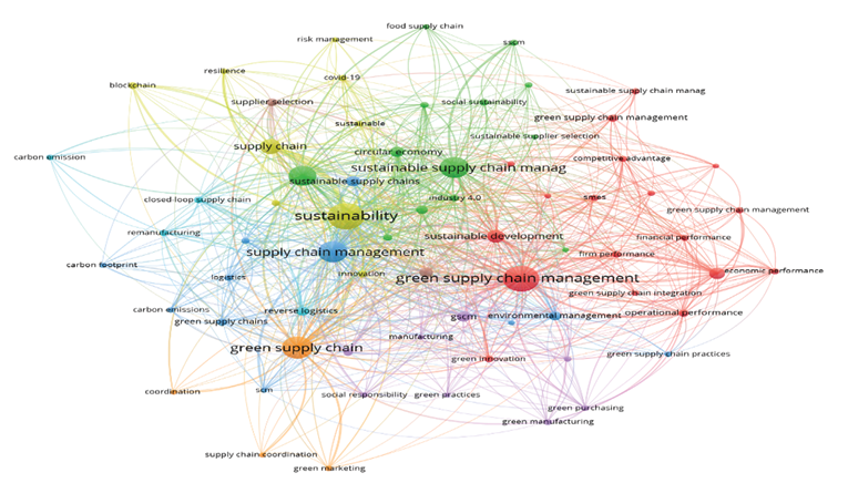 Abstract. Supply chain management is a multi-dimensional approach. Growing eco-consciousness has forced businesses to optimize operations and incorporate green practices across all the stages of supply chain in manufacturing and service sectors. Reviewing the past research literature propels us to understand its current and future prospects. Employing a systematic analysis, this research explores the intellectual structure of green supply chain practices and their connection to performance outcomes in various industries. This study covers a systematic literature review, content analysis, and bibliometric analysis on green supply chain management using VosViewer. It utilizes a PRISMA-guided screening method for identification, screening, eligibility and inclusion of literature from the literature available since 1999. The bibliometric analysis reveals key contributors, thematic clusters, prevailing theoretical frameworks, and emerging research trends in the domain of green supply chain management. China, followed by the United States and the United Kingdom, emerged as leading contributors to research in this area, driven by rapid economic growth, heightened environmental concerns, and well-established academic and industrial infrastructures. The study identifies eight thematic clusters within green supply chain management, including the triple bottom line, circular economy, and carbon emissions. The most highly cited papers within these clusters were examined for their methodologies, tools, and key findings, highlighting the prominent theories utilized in this field. Moreover, the research discusses how advanced technologies such as AI, blockchain, and big data analytics are poised to transform supply chains by enhancing decision-making and mitigating risks, thus playing a pivotal role in the future of green supply chain management.