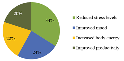 To obtain the statistical results of the conducted laughter therapy, a survey was offered during the study. The questionnaire consisted of 8 descriptive questions, which assessed the following indicators of the impact of laughter (from the most to the least influential) on the body: improvement of mood after laughter (24%), reduction of stress and improvement of general well-being (34%), increase in energy and life optimism (22%), increase in productivity and creativity (20%) (Figure 1). When analysing the data, a statistical and comparative characterisation of the indicators was formed.