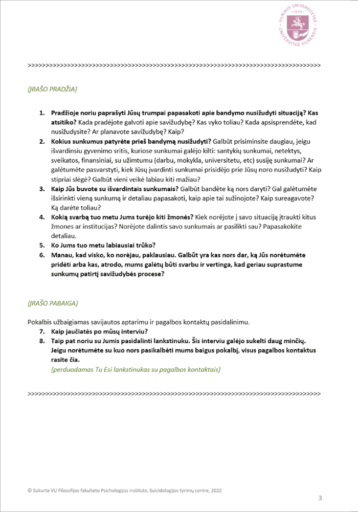 Pusiau struktūruoti interviu sudaryti šio tyrimo autorių Suicidologijos tyrimų centre. Interviu struktūra ir klausimų formuluotės išbandyti su dviem tyrimo dalyviais ir koreguoti pagal gautą grįžtamąjį ryšį. Interviu klausimus galima rasti prieduose (2 priedas).