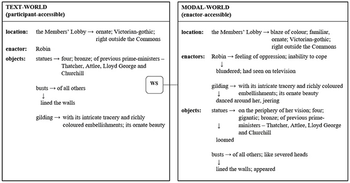 The location is viewed through the eyes of the enactor. However, her modal-world represents a switch from the initial text-world of the real-life place. The reality – the location of the Lobby, the statues of the prime ministers, the location of the busts – merges with the character’s distorted perception. The relational processes “familiar chamber”, “gigantic statues”, “busts like severed heads”, and the function-advancing proposition “the statues loomed” indicate the enactor-accessible nature of the epistemic modal-world. Meanwhile, the initial text-world is participant-accessible. In Robin’s mind, the objects are personified: gilding, tracery, and embellishments “danced around her, jeering at her” (function-advancing propositions). These are intention processes that transform the objects into enactors. The statues and busts are brought into focus; other details are blurry – reflection of the protagonist’s emotional and physical state. The two text-worlds are contrasted: familiar and beautiful versus scary and elusive.