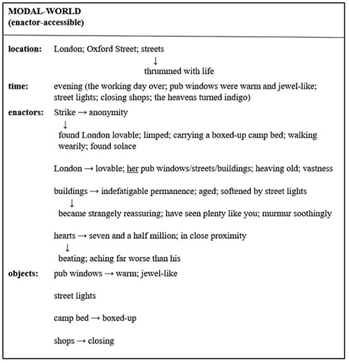 The contrasting details of “warm and jewel-like” pub windows versus “closing shops” are temporal linguistic cues. The city is presented from the protagonist’s perspective. London is simultaneously the location and an enactor in his epistemic modal-world. Its enactor status is revealed through several relational processes and function-advancing propositions: the pronoun her in reference to the “indefatigable”, “heaving old city”, which is capable of being “reassuring”; its buildings “murmur soothingly”; they observe and assess citizens, “We have seen many like you”. Strike agrees (the parenthesis “after all” indicates access to his mind): many people suffer more than he does. He finds “solace” in the interaction. Thus, the city becomes a character in its own right as it features the properties of an enactor in the protagonist’s modal-world.