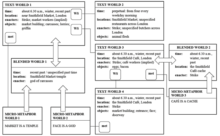 The description contains four text-worlds: Smithfield Market, a world-switch to London meat buyers, a world-switch to the Smithfield Café, and a world-switch back to the market as seen from the café. Initially, these are the omniscient narrator’s presentations of real-life locations. As argued below, three micro-metaphor worlds are created by the enactor (Strike) rather than the narrator. They form blended metaphor worlds that feed into the initial text-worlds of the market and the café.