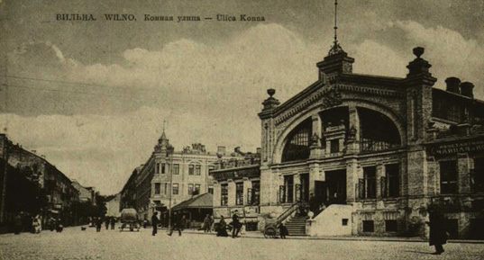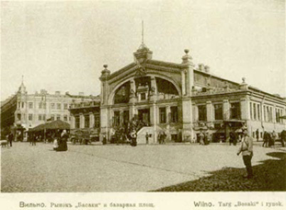 Новый городской объект — современный торговый павильон, заметно изменивший жизнь старого виленского рынка, естественно, получил достойное отражение на почтовых карточках. Рассмотрим в хронологическом порядке зафиксированные на них названия, не всегда следующие хронологии издания самих открыток8. Так, одна из самых ранних открыток с изображением виленского торгового павильона на переднем плане сохраняет название старого рынка Басаки (чаще Босаки, польск. Bosaki) и одноименной площади (см. рис. 11).