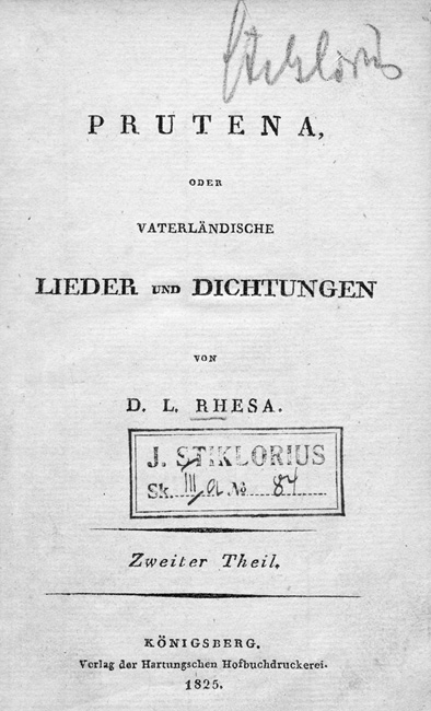 8 L[udwig] Rhesa, PRUTENA, oder preussische VOLKSLIEDER und andere vaterländische Dichtungen, Königsberg: Heinrich Degen, 1809; Idem, PRUTENA, oder vaterländische Lieder und Dichtungen, Zweiter Theil, Königsberg: Verlag der Hartungschen Hofbuchdruckerei, 1825.