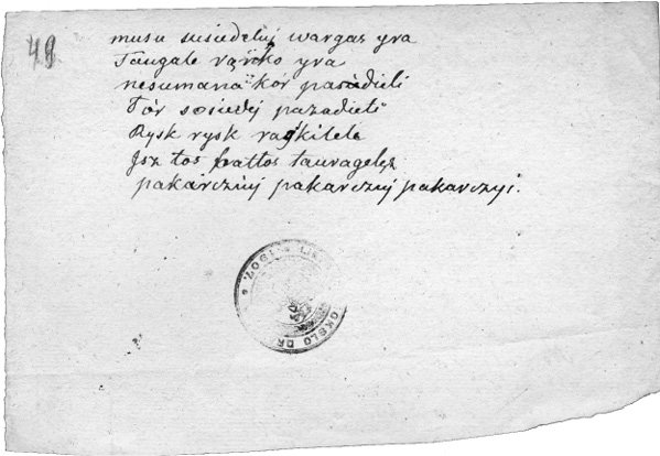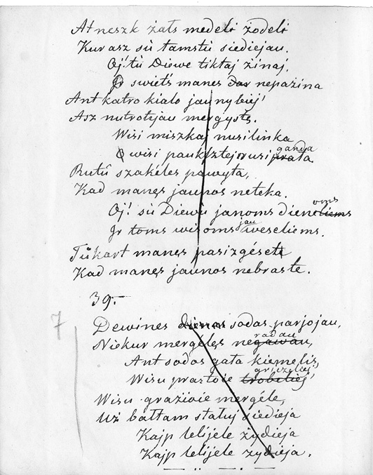 One song, “It Is Hard to our Little Neighbor” (“Mūsų susiedeliui vargas yra”; XXIV bundle f. 33v), may be considered originating in the somewhat earlier period, in the last years of Daukantas residing in St Petersburg (…–1850). Its most palpable orthographic features: <ąn> [an, ọn], <ó> [ọ], possibly <-tĩ>.