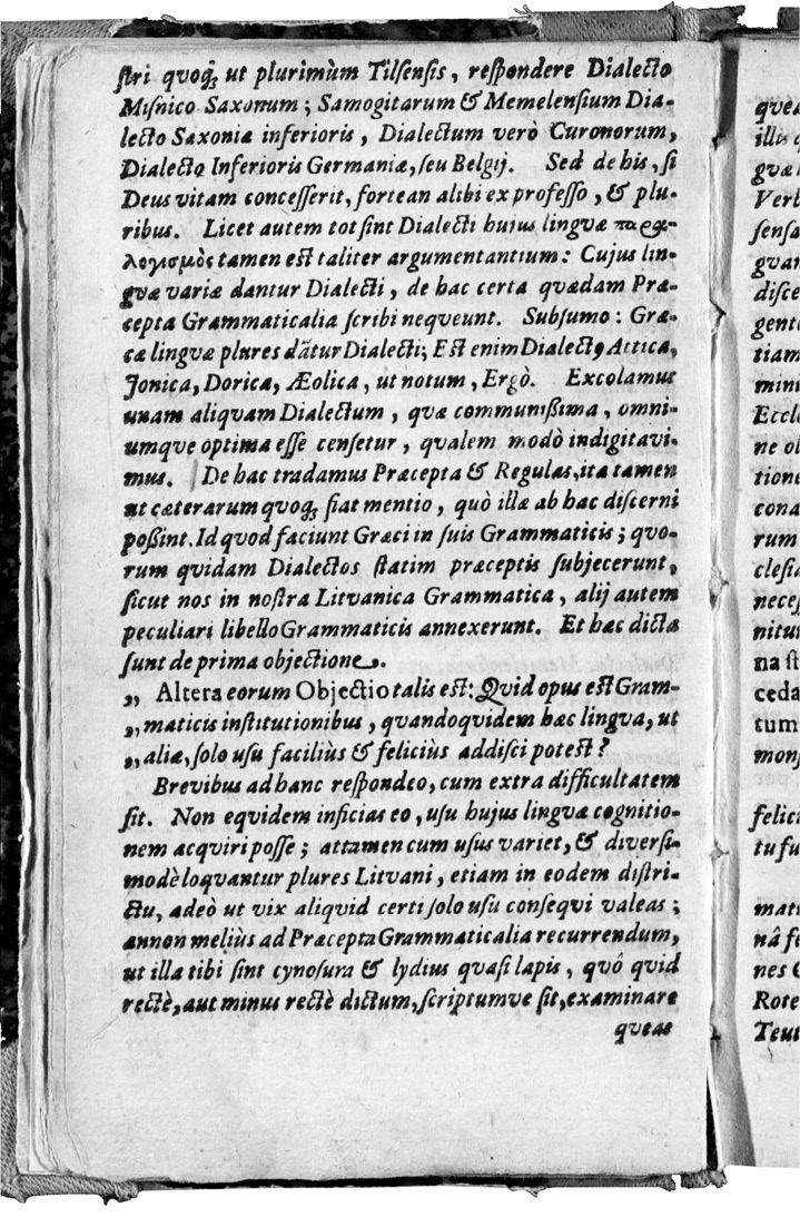 Pronomina aß / tu / jis / & in Plur. mes / ‖ jus / jie non qvidem ut apud Germanos Verbis ſem-‖per adjiciuntur, attamen freqventiùs qvàm apud ‖ Latinos, ut: noru aß taw gér’ daryti / volo tibi ‖ bene facere. innau / jog tu man myli / jog jis ‖ man myl / ſcio, qvòd tu me ames, qvòd ille me ‖ amet. ‖ Dualis verò Numerus nunqvam ferè ſine ſuis ‖ pronominibus ponitur, ut: mudu / wedu ſakowa / ‖ judu ſakota &c. |