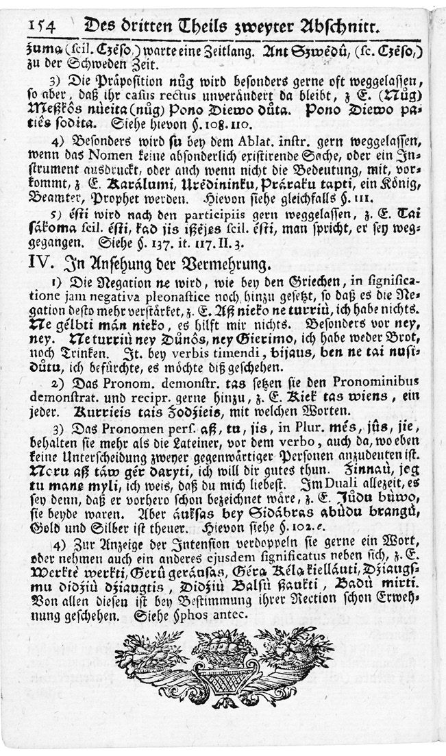 Es wird der Infinitivus einem tempori finito ejusdem radi-ǁcis empha- tice, oder mit Verſtrkung der gemeinen Bedeutung, be=ǁſonders negative gerne wie im Hebriſchen ʒugeſeꜩt, ſo daß das ǁ i ult. in e verndert wird. Ʒ. E. Sakyte ſakaù, ich ſage es dir ernſt=ǁlich. Girdėti ‹err. Girdėte› girdėjo, ſie haben es emſig gehret, ַעֹומְׁש ועְמִׁשּ ǁ Negirdėte negirdėjau, ich habe es ganʒ und gar nicht gehret ǁ áugte áugtumbim, wir mchten ungemein wachſen. Diewè důk ǁ kad Káro daugiaus ne mattyte ne mattytumbim, GOtt laß ǁ uns den Krieg gar nicht einmal ʒu ſehen bekommen. |