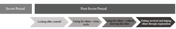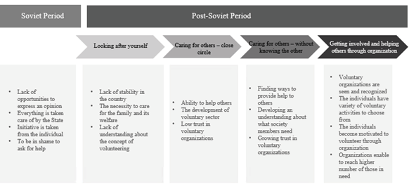 The main traits of each period (Picture 2) show what the main stages for building a civil society might be when a specific regime collapses. The individual perspective at the beginning of the period is widening and through caring for yourself, family members, other members of the society to an organizational level, where the individuals act through organization rather than an individual approach. It enables to expand the reach of those in need, and the benefits provided to the society are widely recognized. The Northern European countries and Great Britain had the highest rates of volunteer activity in Europe (Hodgkison, 2003). In “Eastern block” countries formerly under communist rule, such as Bulgaria, East Germany, Estonia, Hungary, Latvia, Lithuania, Romania and Russia, an undeveloped civil society leaves little room for independent volunteer work (Musick and Wilson, 2000). It is highlighted by researchers that the length of experience under totalitarian regimes decreases generalized trust, which is one of the factors influencing the numbers of volunteers in the specific country. The research has enabled to highlight the change from totalitarian regime and how it affects the attitude towards volunteering.