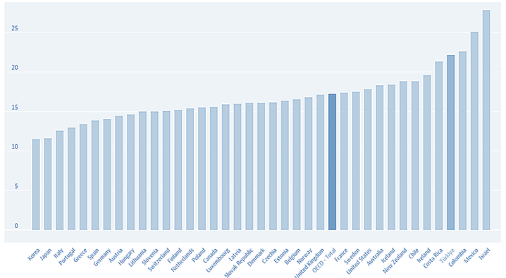 Turkey is among the nations that must prioritize addressing housing issues affecting its youth population. According to data from the Turkish Statistical Institute, 15.2 percent (12,949,817 people) of the country‘s total population (85,279,553 people) falls within the age range of 15–24. Moreover, it‘s reported that 49.3 percent of this young population is of age between 18 and 22, coinciding with the period of bachelor education (TUİK, 2023). When comparing the proportion of youth populations with other countries, Turkey notably stands out, boasting one of the highest percentages of youth among OECD nations, at 22.2 percent (compared to the OECD average of 17.3 percent), as depicted in Graphic 1 (OECD, 2024). This unequivocally underscores the significance of young people for the country.