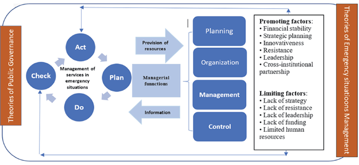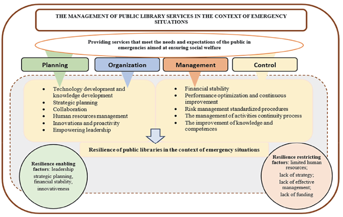 The basis of this model is grounded on the idea that the head of each public library should properly organize the functioning of the classical management functions (i.e. planning, organization, management and control) to ensure the management of public library services in emergencies, which is influenced by the following enabling/promoting (financial stability, strategic planning, inter-institutional collaboration, innovativeness, leadership, etc.) and restricting/limiting factors (lack of strategy, lack of resilience, lack of leadership, limited human resources, etc.), which are evident in crisis situations (Pitrėnaitė, 2009; Survila, Valickas, 2015; Matthews, 2019; Vivarelli, 2019; Liukinevičienė, Kuodytė, 2021).
