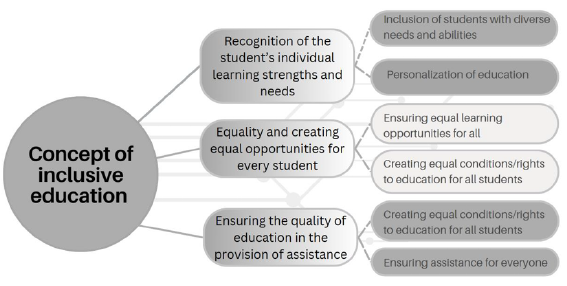 Ensuring the quality of education in the provision of assistance. The research participants associate the concept of inclusive education with quality education for every learner (“high-quality education”, “accessible to everyone”, “regardless of their abilities”), emphasis was also placed on “helping each student”, “taking into account their needs”, which are prerequisites for “successful learning in the classroom.”