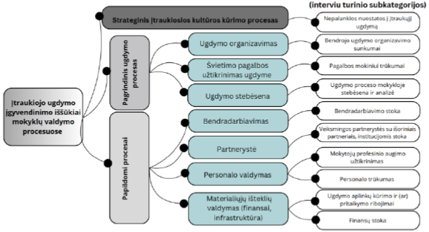 Nustatyta, kad švietimo vadovams kuriant įtraukios mokyklos kultūrą, iššūkių patiriama ne tik strateginiame, bet ir pagrindiniame – ugdymo – procese. Išskirtini ugdymo organizavimo, švietimo pagalbos užtikrinimo ir ugdymo stebėsenos iššūkiai.