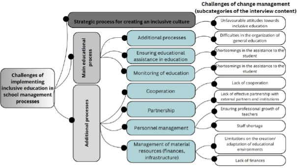 Referring to the data of the content analysis of the interviews, the essential challenges of change management emerged (Figure 2). The school heads, while creating an inclusive school culture as part of a strategic process, experience unfavourable attitudes towards inclusive education among members of the school community. It is noted that “negative attitudes among teachers and parents” are still prevalent, “the most commonly heard statement is: inclusive education is good, but not in my classroom.” This shows that some community attitudes limit the development of the strategic process, therefore, the managers are looking for coping methods and means to implement goals through changing attitudes. According to the school heads, positive attitudes are a decisive factor in implementing inclusive education in schools, therefore it is important to change negative attitudes of the “whole school community” towards children with special educational needs to positive ones. The managers emphasize that “it is important to form positive attitudes of the community towards each child <...>” and to strive for “a united approach of all in one direction.” The study found that the means and methods that strengthen teachers’ positive attitudes towards the implementation of inclusive education, i.e., the means of strengthening the psychological and emotional state, are such as support and encouragement from community members (“We have an incentive system”; “motivational measures are used”); support for teachers, e.g., hearing out (“we communicate a lot <...>”, “we do not leave teachers alone with problems, we talk”). The managers also implement activities that promote teachers’ professional development, e.g., encourage teachers to organize events for the dissemination of good practice (“creating an opportunity to share good practices”, “achievements of other schools”); to participate in training courses to improve pedagogical competences (“quality practical training courses for teachers”, “providing the opportunity to participate in international training courses”); to prepare and implement international projects and scientific/methodological conferences. Positive attitudes of teachers are strengthened through methods and means of peer feedback. According to the school heads, “continuous reflection” is important in educational organizations, therefore, they create conditions for learning from each other, “discussing in methodological groups” “good practice examples”, “successful activities with students with SEN”, providing “peer support” based on “benevolence towards each other.” It is emphasized that “round table discussions”, meetings are organized, consultations are held with the services (using the help of the Pedagogical Psychological Service) and professionals; it is encouraged to follow “specific recommendations” in pedagogical activities.