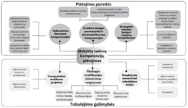 Švietimo organizacijų vadovai įvardija tris pagrindines kompetencijas, kurioms plėtoti norėtų skirti daugiau dėmesio įtraukios mokyklos kūrimo kontekste. Tai vadovavimas žmonėms, strateginio ir švietimo įstaigos valdymo bei partnerystės ir bendradarbiavimo kompetencijos. Švietimo įstaigų vadovai įtraukiojo ugdymo pokyčių valdymo metu tobulina minėtas kompetencijas profesinio mokymosi ir tobulėjimo formomis – tikslingu dalyvavimu renginiuose ir trumpalaikiuose mobilumo projektuose, kurių turinys ir veiklos gali padėti plėsti partnerystę ir bendradarbiavimą, tobulinti strateginį ir pokyčių valdymą.