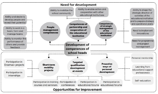 The heads of educational institutions, when improving their managerial competences, most often use the following professional learning and development opportunities – targeted qualification development at events, short-term mobility projects, and proactive ways of personal development. The qualification is developed through “purposeful participation in training courses”, “on the topic of inclusion and application of universal design principles in the learning process, for example, “Mission is Inclusive Education””, training courses of the Millennium Schools Programme “Effective Educational Leadership”. The “platinum Pedagogas.lt platform, which contains many and very valuable training courses” is also used. The qualification is improved by participating in seminars (“Targeted qualification development <...> in seminars”), such as in “the studies of the approach of the universal design for learning in inclusive education.” The cooperation and participation of the community of the educational institution in international projects (“We participate in Erasmus+ projects”) is highlighted as one of the aspects that promote the growth of leadership competences. The heads of educational institutions engage in proactive self-education, i.e., personal mentorship, learning from educational support specialists.