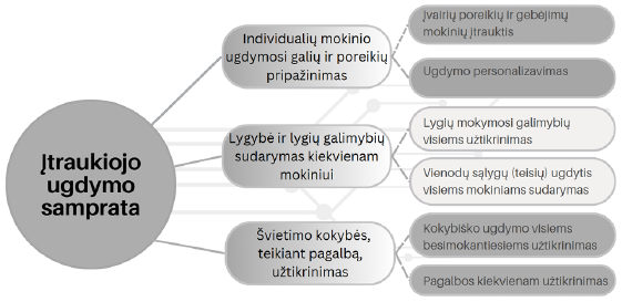 Minėtina, kad vadovai įtraukiojo ugdymo sampratą sieja su tokiomis įtraukiojo ugdymo vertybėmis kaip kiekvieno mokinio individualių poreikių ir gebėjimų pripažinimas.