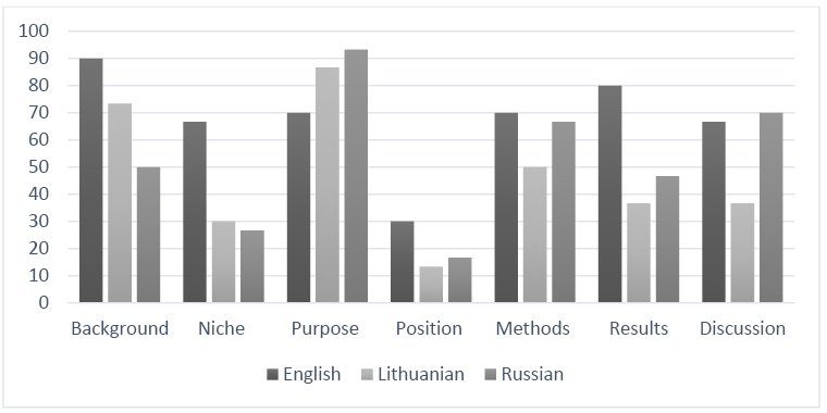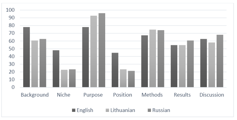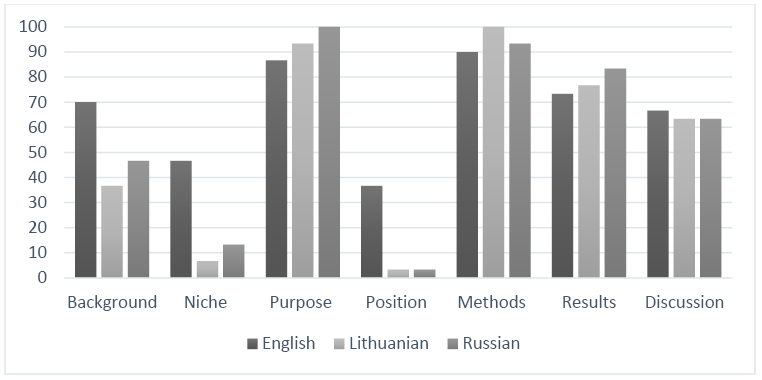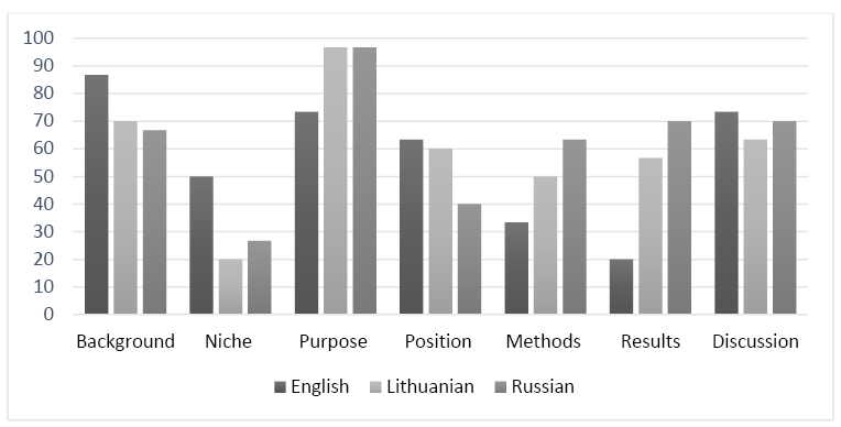 A quantitative comparison of literary abstract structure elements (as indicated in Figure 5) reveals similar trends in the use of 4 out of 7 moves in Lithuanian and Russian abstracts (Purpose, Announcing position, Methods and Discussion moves) in comparison to abstracts in English.