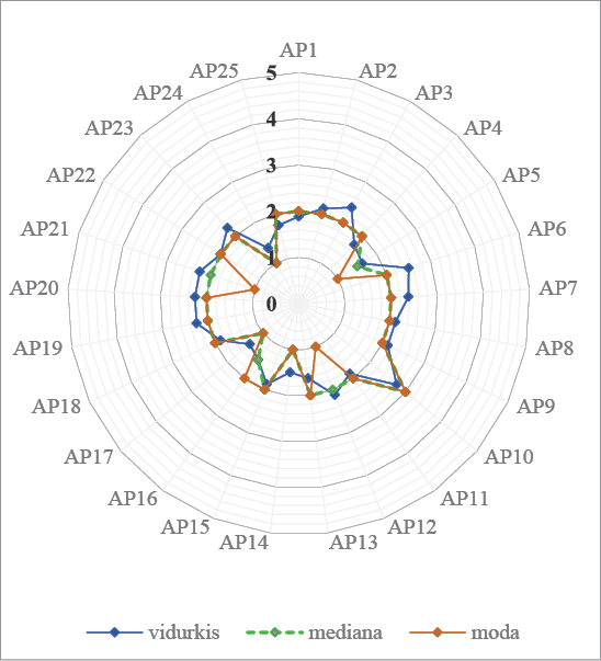 Teiginius (apskaitos alternatyvų pasirinkimus) ekspertų buvo prašoma vertinti Likerto skale, kur 1 reiškia, kad apskaitos alternatyvų pasirinkimas turi didelį neigiamą poveikį įmonės apskaitai ir apskaitos rezultatams (apgaulė), o 5 – didelį teigiamą poveikį apskaitai ir apskaitos rezultatams (padeda rasti optimalius sprendimus). Įvertinus skalės patikimumą buvo apskaičiuotas Cronbach alfa koeficientas. Jis siekia 0,948. Ekspertų pateiktų atsakymų padėtis ir sklaida pavaizduota 1 paveiksle.
