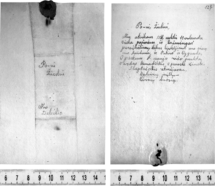 1–2. Prisikėlimo apyg. Maironio rinkt. vadui J. Paliūnui (Žiedas – vienas iš daugelio jo sakytinių slapyvardžių) adresuotas tos pačios rinktinės Mindaugo tėvūnijos Lukšio dalinio partizano Česlovo Jankūno-Debesėlio laiškas. Gerai matyti lankstymo būdas, perlaužtas antspaudas, apie 1949–1950m. Maironio rinkt. archyvas – LYA, f. K–5, ap. 1, b. 44, l. 127