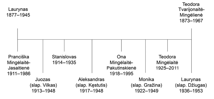 Keturiolikos laiškų pluoštą yra perpynusi kovojusių ir žuvusių Mingėlų brolių ir sesers gija, paženklinęs jų atminimas, persmelkęs netekties skausmas ir artimųjų ilgesys. Išlikusioje korespondencijoje ypač svarbus brolis Laurynas Mingėlas, pasivadinęs ir namiškių partizaninio karo metais vadintas Laime. Šio laisvės kovotojo portretas ryškėja iš trijų unikalių jo paties seserims į tremtį parašytų ir iliustruotų laiškų (laišk. 1–3)3. Toliau apie Lauryną kalba artimiausias jo bendražygis, politinis kalinys ir tremtinys Viktoras Šniuolis-Vytvytis, ir partizanų rėmėja Teresė Mikniūtė iš Minaičių k. (Radviliškio r.).
